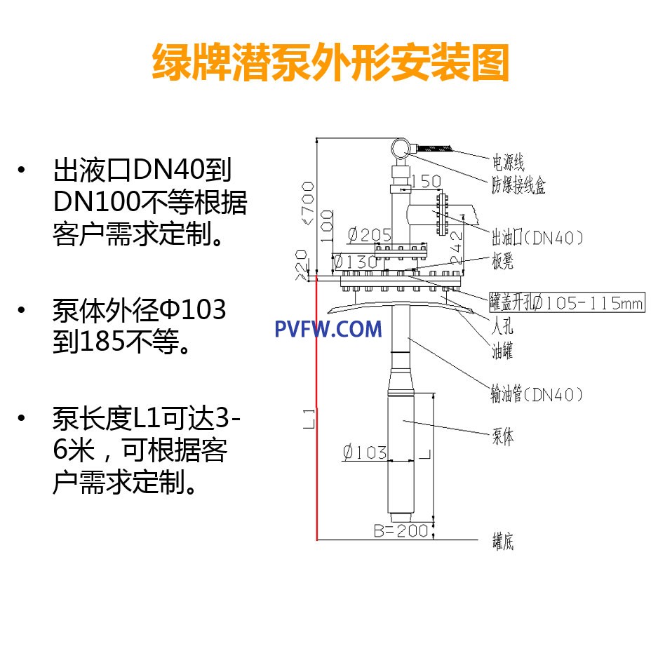绿牌防爆化工潜泵新结构机泵一体同轴连接,泵工作电机定子和转子之间过液,给泵降温和轴承润滑,工作时电机没有温升,以上两点决定了液下泵超长的寿命,是长轴液下泵的替代品。绿牌新型液下泵运行平稳、节能、环保、低噪音终身免维护。
